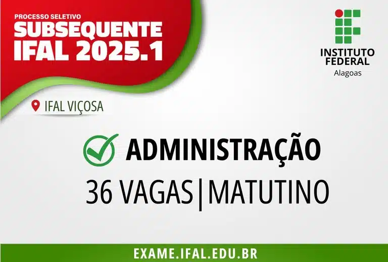 O Instituto Federal de Alagoas (Ifal) Campus Viçosa está com inscrições abertas para o Exame de Seleção nº 2025.1.23, destinado ao curso técnico em Administração, na modalidade subsequente ao ensino médio. São 36 vagas disponíveis, com aulas no turno matutino.